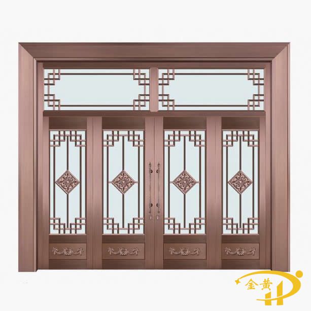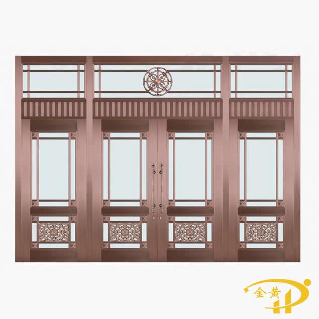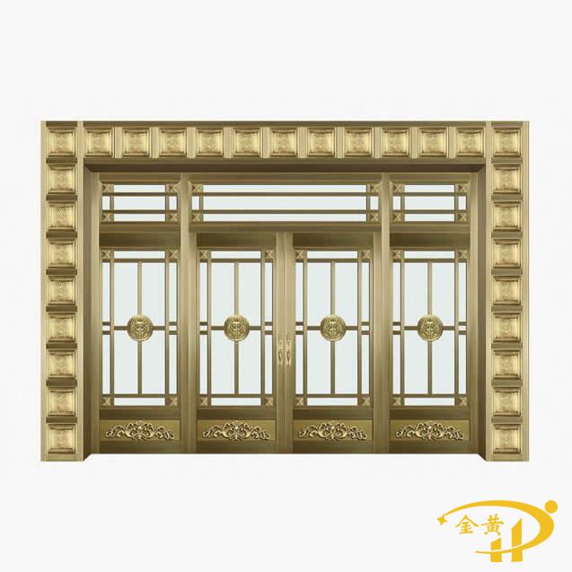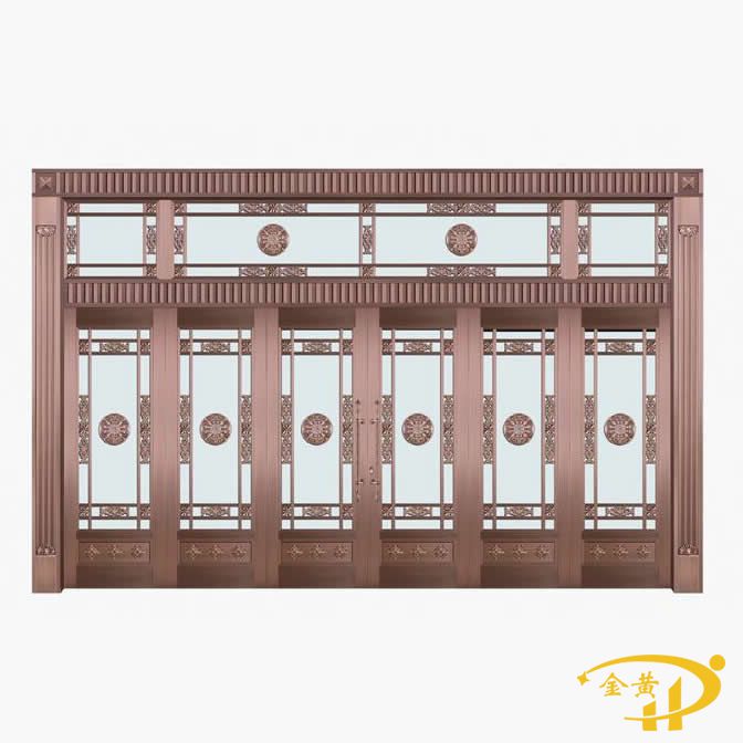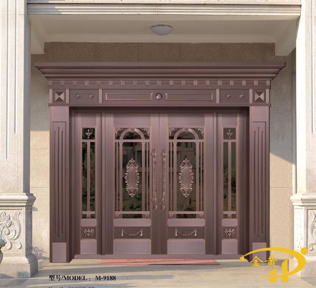 本款纯铜玻璃酒店大门,型号是M-9195,门面采用精工拼接工艺,原材料为洛阳纯紫铜或黄铜制作而成。 注意:罗马柱、门头高度、墙体厚和门柱宽度可根据客户实际要求量身定制。