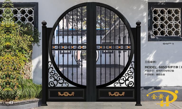 本款圆弧铝艺庭院大门,型号是6850,任何尺寸均可定做,镂空门扇采用各种尺寸铝型材及铝花拼接而成,实心门扇采用整体铸铝板而成。注意:整体纯铝门柱款式及尺寸可根据客户实际要求量身定制。