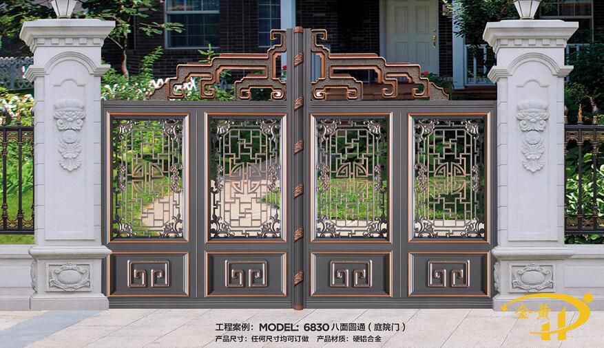 本款别墅庭院大门,型号是6830,任何尺寸均可定做,镂空门扇采用各种尺寸铝型材及铝花拼接而成,实心门扇采用整体铸铝板而成。億彩注意:整体纯铝门柱款式及尺寸可根据客户实际要求量身定制。